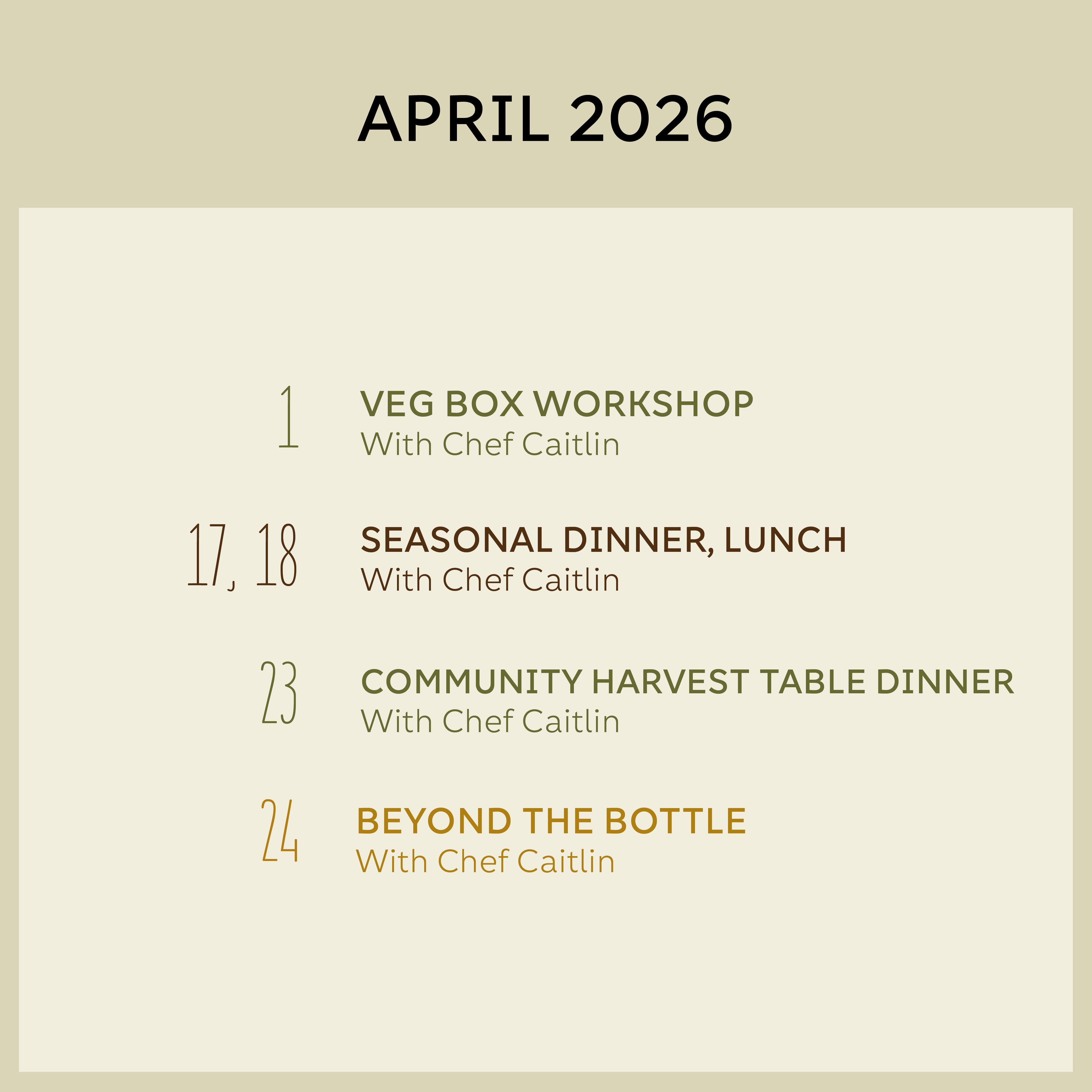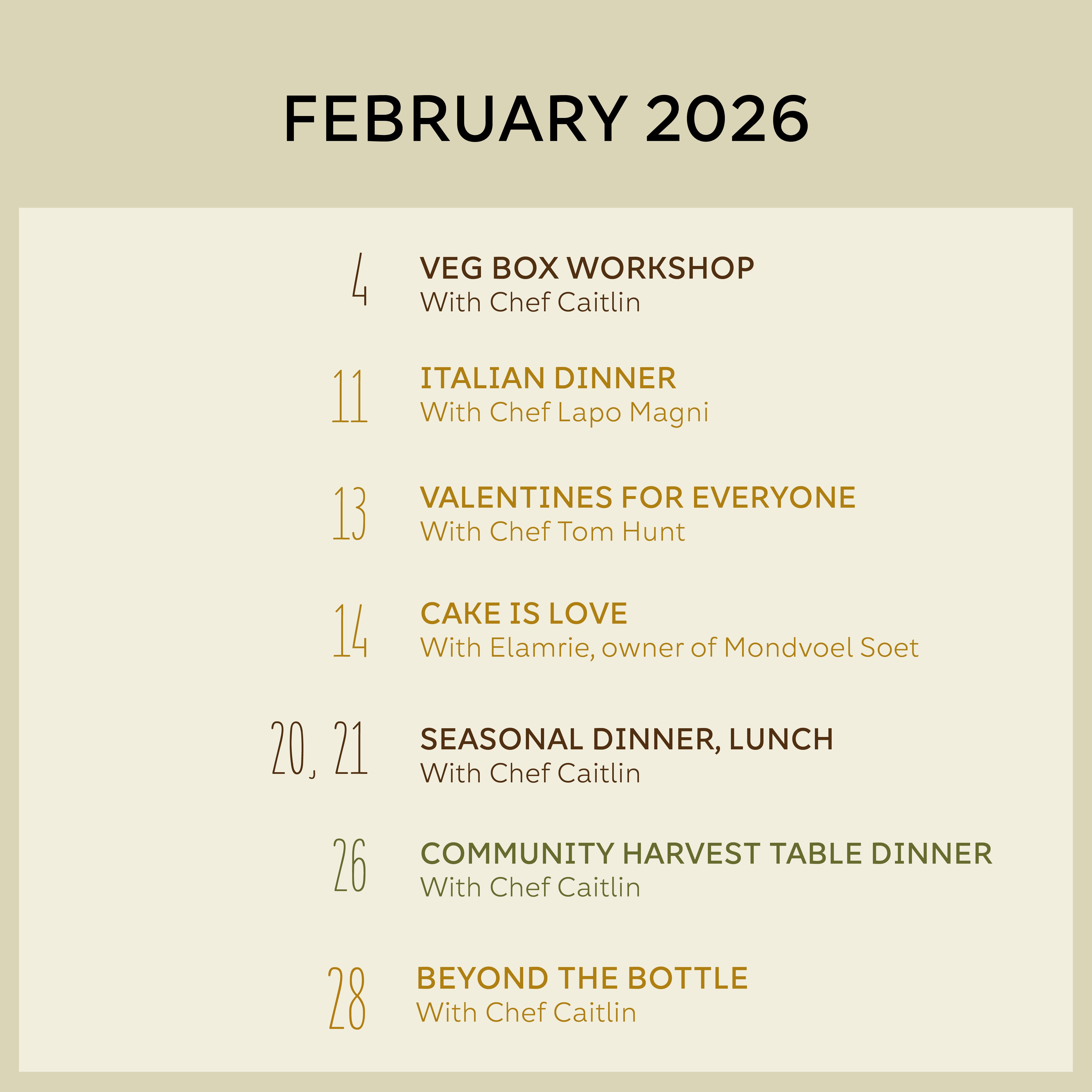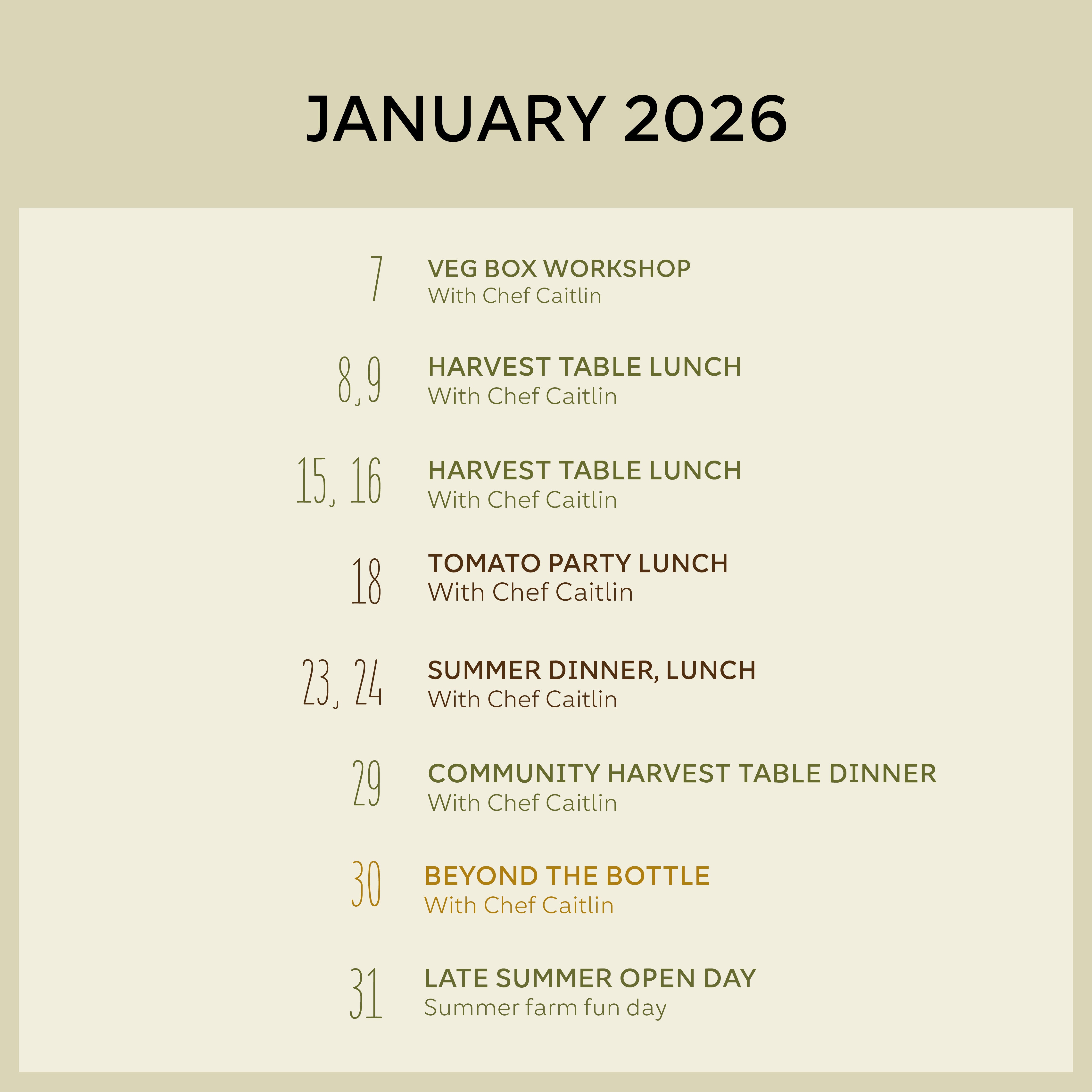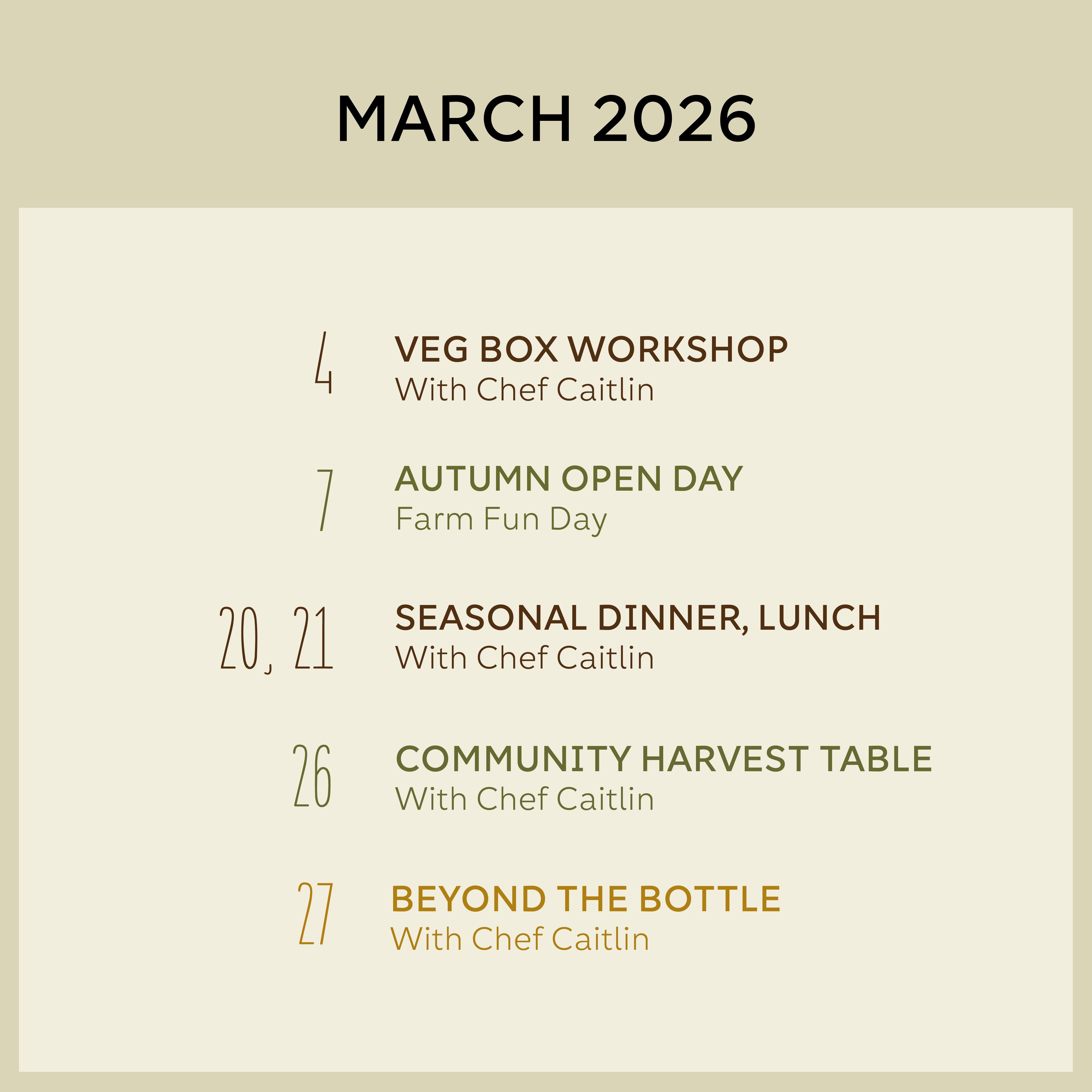 Our events are a reflection of the farm and its seasons. In spring and summer, the soilwarms and we enter a period of plenty. Events celebrate the new season, feasting, andthe buzz of the farm. As autumn approaches, we indulge in slower days, gather cozily,and honour the earthier storage crops. Winter is a time of rest, taking an annual wintertrip, and dreaming about the new season.